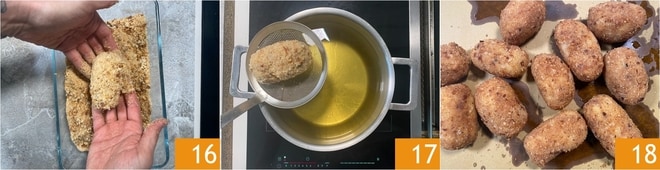 Pass the battered supplì in rustic breadcrumbs 16 and proceed in this way to form all the others; with these doses, you will get about ten. You are ready to fry: gently dip 1-2 supplì at a time into the oil at a temperature of 320°F 17 and fry for about 4 minutes until golden and crispy. Drain on paper towels 18 and enjoy your cacio e pepe supplì while still hot!
