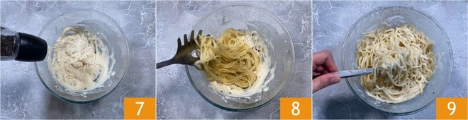 Add a generous grind of black pepper 7, then drain the tonnarelli here 8 and mix everything well 9.