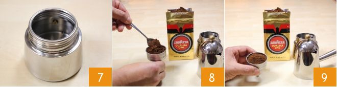 Now prepare the coffee using a moka pot. To get excellent coffee, fill the boiler of your coffee maker with cold, low-limestone water, being careful not to exceed the safety valve 7 (otherwise you'll get a longer coffee). Fill the filter with ground coffee forming a “mound“ 8, which you will level by tapping the filter on the table with firm movements 9. Do not press with the spoon, nor make holes in the surface.