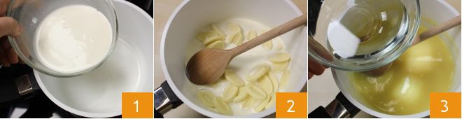 To prepare Padovan coffee, start by making the white chocolate and mint ganache (we recommend preparing it the night before): heat the cream in a saucepan over low heat, without bringing it to a boil 1, then melt the white chocolate pieces in it, stirring often 2. Once all the chocolate has melted, add the white mint syrup and mix well 3.