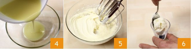 Transfer the obtained mixture to a bowl and place it in the refrigerator to cool for 24 hours 4; after the indicated time, remove it from the refrigerator and whip it using electric beaters 5. Now take a spoonful of ganache and spread it on the side of a medium glass 6.