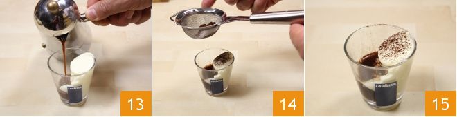 Now pour about 1.35 oz (40 ml) of coffee into the glass (equivalent to a cup) 13 and decorate with a light dusting of bitter cocoa (14-15).