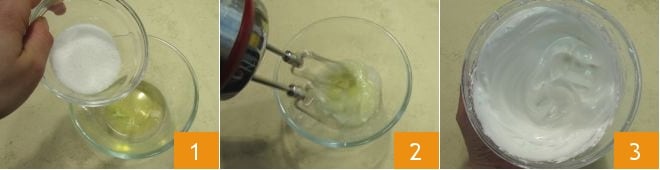 To make the cake for two, start by preparing the cocoa sponge cake: separate the yolks from the whites and place them in two separate bowls. Take the bowl with the egg whites, add half of the sugar 1 and use an electric mixer 2 to beat them until very stiff 3.