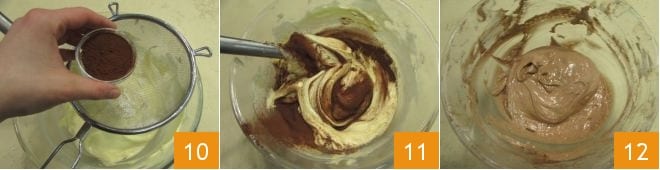Mix the dry ingredients into the egg mixture with the spatula, always making delicate movements from bottom to top, then also sift in the cocoa powder 10 and mix again to incorporate it 11 until you get a homogeneous, frothy, and lump-free mixture 12.