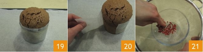 Once the baking time for the sponge cake is over (check with a toothpick that it is cooked inside), let it cool slightly inside the ring mold 19, then unmold it and gently remove the parchment paper lining 20. Let the sponge cake cool completely, in the meantime proceed to prepare the cream: place the pink peppercorns inside a sieve, position it over a bowl, and rub them with your fingertips to shed them; this way the outer shell will remain in the sieve, while the bowl will collect a powder that will be used for the cream 21.
