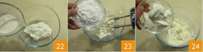 Put the ricotta in a separate bowl, add the heavy cream 22 and briefly mix with the electric beaters, then add the powdered sugar 23 and continue to work with the mixer to blend all the ingredients well. Add the mascarpone 24 and continue working the cream with the electric beaters.