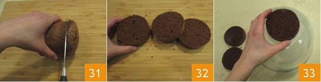 At this point, the sponge cake will have cooled down, so place it on a cutting board and remove the top with a serrated blade knife 31; the small cake will then be about 2.5 inches tall, so cut it horizontally into 3 parts, obtaining 3 discs each 0.8 inches thick 32. It's time to assemble the cake: if you don't have a turntable stand, you can use a fairly large bowl turned upside down on the work surface. Place the sponge cake base on the inverted bowl 33