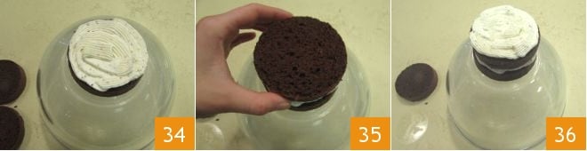 and fill the surface with the ricotta cream you placed in the piping bag 34. Add the second sponge cake disc 35 and fill this one too with the ricotta cream 36, then cover it all with the last layer of sponge cake, without filling it.