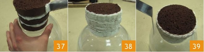 Now move on to coat the cake: place the piping bag nozzle on the outer side applying light pressure and simultaneously turn the bowl 37 to cover the side surface of the cake evenly 38. Finally, use a spatula to smooth the surface, helping yourself by turning the bowl as a base and occasionally wetting the spatula with a little water 39.