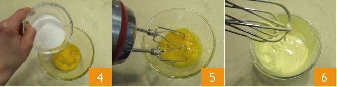 Now take the bowl with the yolks, add the other half of the sugar 4 and beat with the electric mixer 5 until they become light and frothy 6.