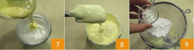Combine the yolk mixture with the beaten egg whites 7 and gently fold with a spatula from bottom to top to avoid deflating the mixture 8. Place a sieve over the bowl with the egg mixture and sift in the flour and baking powder 9.