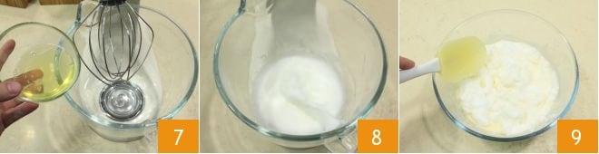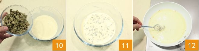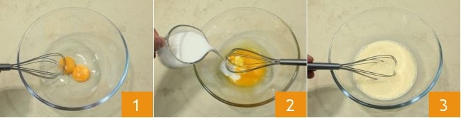 To make the capers fritters, start by preparing the batter: separate the egg whites from the yolks and beat the yolks with a whisk 1, then gradually add the milk 2 while continuing to mix to obtain a homogeneous mixture 3.