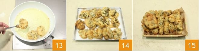 Drain the fritters 13 when they are golden brown and place them on a tray lined with paper towels to absorb the excess oil 14. The capers fritters are ready; enjoy them while hot 15!