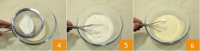 Incorporate the sifted flour 4, salt, and mix with the whisk 5 to combine 6; you should obtain a smooth, fluid, and lump-free batter.