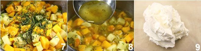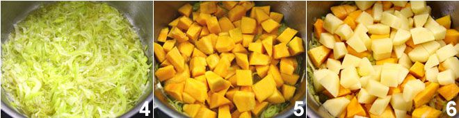 In a saucepan, heat 4 tablespoons of extra virgin olive oil, let the leek soften 4 and add the pumpkin 5 and potato pieces 6,