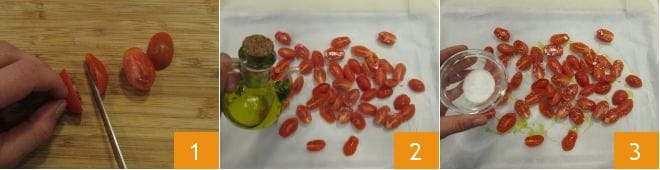 To prepare the caprese pasta, first wash the cherry tomatoes, then cut them in half 1 and place them on a baking sheet lined with parchment paper, season them with olive oil 2, sugar 3, and salt