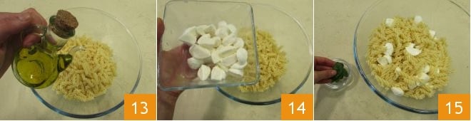 Season with a drizzle of olive oil 13 and let it cool, then add the mozzarella balls 14, the fresh basil leaves 15