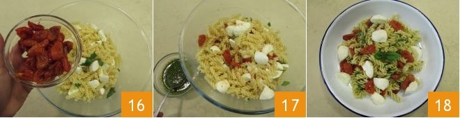 and the cherry tomatoes 16. Enhance with the basil sauce prepared earlier 17, mix, and serve your caprese pasta 18!