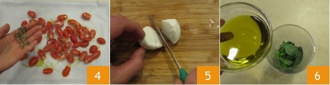 and fresh thyme leaves 4. Bake the cherry tomatoes in a preheated static oven at 428°F for about 15 minutes. Meanwhile, place a pot full of salted water on the stove, which will be used for cooking the pasta, and bring it to a boil. Cut the mozzarella balls in half 5; then prepare the basil sauce: put the previously cleaned basil leaves in a blender glass, pour the oil 6
