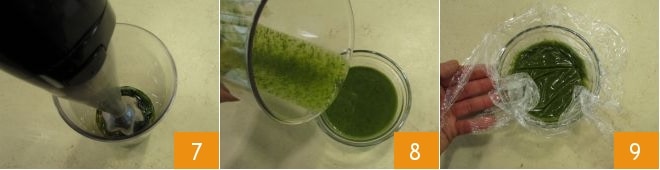 and blend with an immersion blender 7 to obtain a sauce that is not too thick, transfer the sauce to a small bowl 8, cover with plastic wrap to prevent oxidation, and place it in the refrigerator 9.