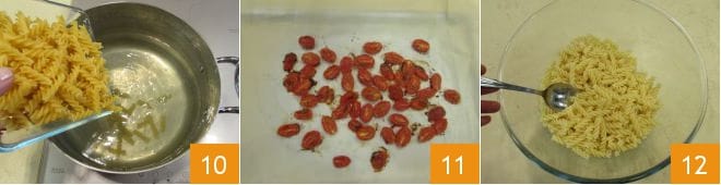 Cook the pasta 10 according to the cooking times indicated on the package. Meanwhile, the cherry tomatoes will be ready, take them out of the oven 11 and let them cool. Drain the pasta well and pour it into a bowl 12.