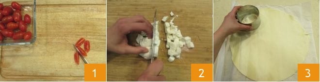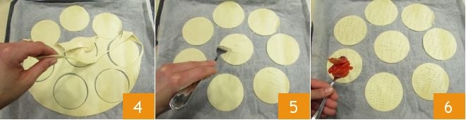 Remove the excess dough 4 and prick the discs with a fork 5. Now add a tablespoon of cherry tomatoes on top of each disc 6,