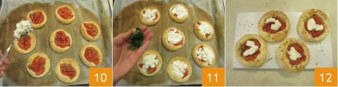 When the puffs are golden, remove them from the oven and add a teaspoon of mozzarella cubes on each one 10, then bake again for a couple of minutes. Once out of the oven, add some fresh basil torn by hand 11 and serve your Caprese puffs hot and fragrant 12!