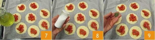 drizzle with a bit of olive oil 7, a pinch of salt 8, and some dried oregano 9, then bake in the preheated static oven at 392°F for 10 minutes.