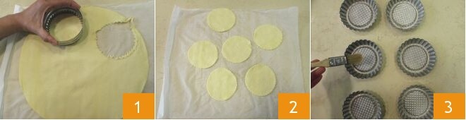 To make the Caprese tartlets, first prepare the pastry bases: roll out the sheet of puff pastry and cut 6 circles using a pastry cutter with a diameter of 4.75 inches 1, then remove the excess pastry 2. Butter 6 tartlet molds of the same diameter 3
