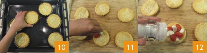 After the baking time, take the tartlets out of the oven 10, let them cool slightly and remove them from the molds. At this point, you can fill the tartlets by arranging the cherry tomatoes alternated with the mozzarella balls on the surface 11. Season with a pinch of salt 12,