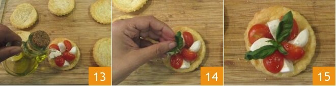 a drizzle of oil 13, a basil leaf, and a pinch of oregano 14 and proceed in the same way with all the others: your Caprese tartlets are ready to be served 15!