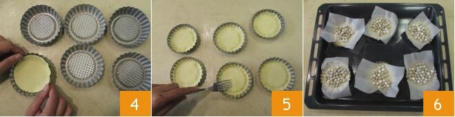 and place the puff pastry circles inside, pressing the edges well 4, then prick the base with a fork 5. Place a rectangle of parchment paper on each tartlet, cover it with baking spheres (alternatively you can use dried legumes) 6 and bake in a preheated static oven at 356°F for 15 minutes. After this time, remove the parchment paper and spheres and continue baking for another 7-8 minutes.