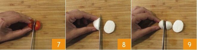 Meanwhile, prepare the ingredients to fill the tartlets: wash the cherry tomatoes and cut them in half 7, then cut the mozzarella balls in half 8 and finally into quarters 9.