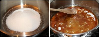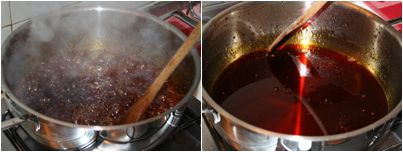 When the sugar has caramelized and reached the typical brown color, directly add the boiling water to the pot and stir quickly.
