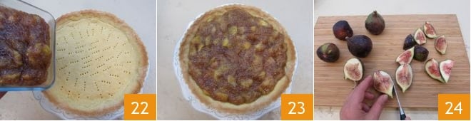 Let the pastry cool and only when the fig compote is also cool can you pour it over the base of your tart 22. Smooth the surface well 23 and start caramelizing the figs. Clean the figs needed for decoration by rinsing them very gently with cold water and, without peeling them, cutting them into 4 wedges 24.