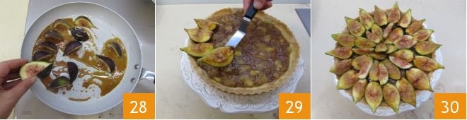 At this point, add the figs and let them caramelize on both sides for a couple of minutes 28. Then using a spatula and being careful not to burn yourself, place the caramelized figs on the tart 29. Finish decorating your caramelized fig tart and serve it 30.