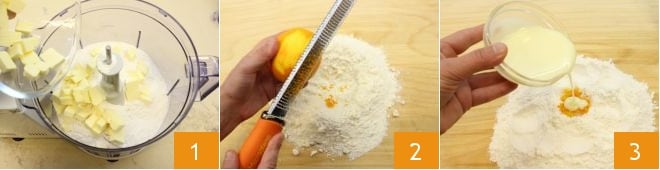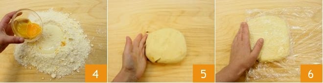 and an egg yolk 4. Quickly work the dough with your hands, to prevent it from heating up too much. Form a ball 5, flatten it and wrap it with plastic wrap 6; place the crust to set in the refrigerator for about 30 minutes.
