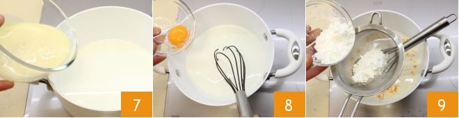 Meanwhile, prepare the orange custard: in a saucepan, pour the fresh milk and condensed milk 7, then mix with a whisk to combine the ingredients. Add the egg yolks, one at a time 8, and the sifted cornstarch with a strainer 9.