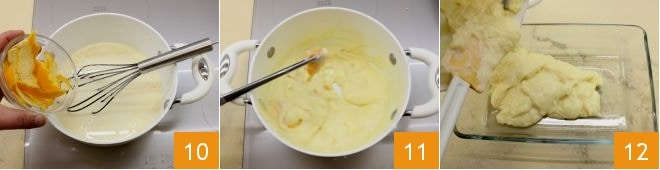 Then add the whole zest of 1 untreated orange 10 and turn on the low heat to cook the cream and let it thicken, stirring continuously. Once ready, remove the orange zest 11 and pour the custard into a large and shallow baking dish 12.