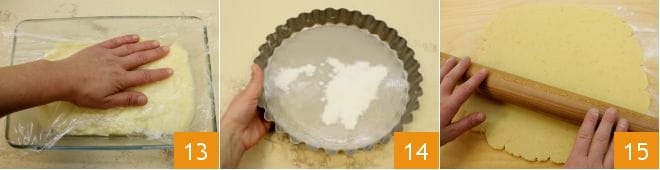 Cover with contact film 13 and let it cool completely first at room temperature and then in the refrigerator. Butter and flour a tart mold with fluted or smooth edges of 10 inches in diameter 14. Take the crust and roll it out to a thickness of 1/5 inch 15.