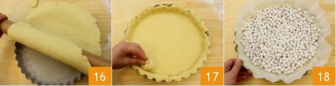 Roll the dough onto the rolling pin and gently unroll it onto the mold 16, then trim the edges, removing excess dough, and use it wrapped in a little plastic wrap to adhere the bottom well to the mold 17. Proceed with the blind baking: line the crust with parchment paper and place ceramic spheres (or legumes such as beans or chickpeas) 18. Then bake in a preheated static oven at 340°F for 20 minutes (or in a convection oven at 320°F for 10 minutes). Then remove the weights and bake for another 10 minutes at the same temperature (5 minutes if using a convection oven).