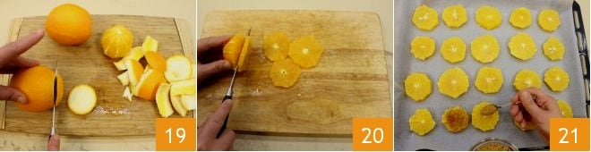 Meanwhile, prepare the caramelized oranges for decoration: peel the oranges 19, cut them into thin slices of about 3/8 inch 20, and place them on a baking tray lined with parchment paper. Sprinkle each slice with raw cane sugar 21 and place them under the grill for about 10 minutes at 465°F-480°F.