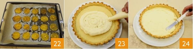 Once ready, take them out of the oven 22 and let them cool slightly. Now that all the preparations are ready, assemble your caramelized orange tart: take the cooked and cooled base, then pour the custard into a piping bag without a nozzle and distribute it evenly 23, leveling with a spatula 24.