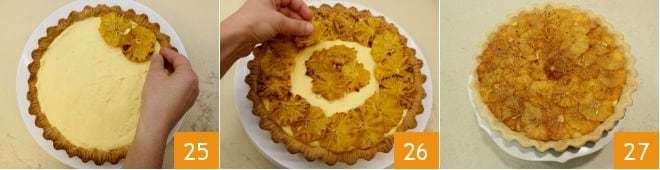 Then arrange the orange slices on top of the cream, arranged in a radial pattern (25-26) to cover the entire surface: your caramelized orange tart is ready to be enjoyed 27.