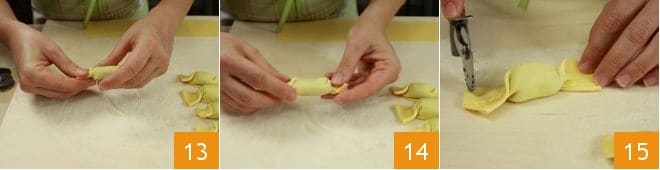 Roll out the egg pasta into a very thin sheet, which you will cut into rectangles measuring about 4x3 inches 10. In the center of each rectangle, place a scant teaspoon of filling 11 and roll the sheet over itself on the longer side 12.