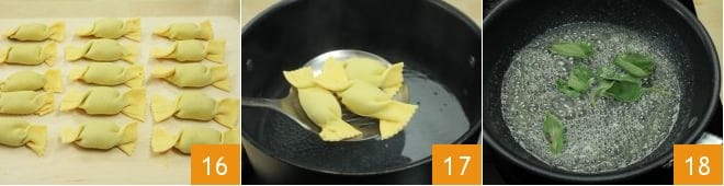 Once you have shaped all the candies, place them on a floured board and let them dry for about an hour 16. Cook the pasta in salted boiling water for at least 5 minutes 17, meanwhile, in a pan, brown the sage leaves in melted butter 18. Once cooked, drain the candies and season with butter and sage and grated Parmesan cheese to taste. Your ricotta and spinach candies are ready to be served!