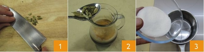 To make the cardamom tiramisu, first cut the cardamom pods in half 1, prepare the moka coffee, add the cardamom 2, and let it infuse overnight. The next day, focus on the rest of the preparation, starting with the mascarpone cream: pour water into a small pot and add the granulated sugar 3. Stir to moisten the sugar well, then heat gently until the syrup reaches 250°F (to monitor the temperature accurately, use a food thermometer); if you don't have a thermometer, the syrup is ready when small white bubbles form on the surface.