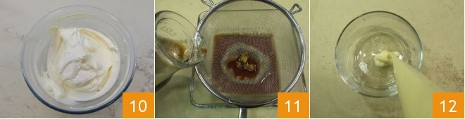 until you obtain a smooth cream 10. Everything is ready to assemble the cardamom tiramisu: strain the coffee through a sieve 11, transfer the mascarpone cream into a piping bag, and squeeze a bit of cream at the bottom of the glass to create a first layer 12