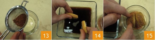 dust the surface with unsweetened cocoa powder 13, now break the ladyfingers, dip them in coffee to soak them 14, then lay them in the glass 15.