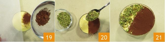 and dust cocoa on the uncovered part 19, garnish the other half with chopped pistachios 20. The cardamom tiramisu is ready to be enjoyed 21.